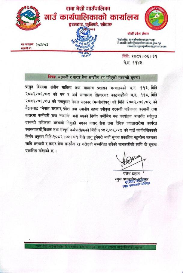 अस्थायी र करार सेवा सम्झौता रद्व गरिएको सम्बन्धी सूचना !!!