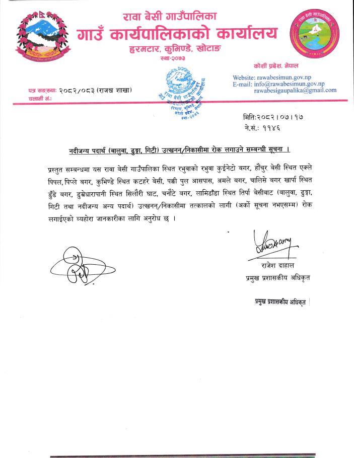 नदिजन्य पदार्थ( बालुवा, ढुङ्गा, गिटी) उत्खनन/ निकासामा रोक लगाउने सम्बन्धी सूचना !